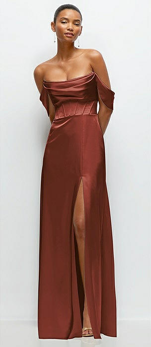 Cowl Neck Off-the-Shoulder Stretch Satin Fit and Flare Corset Maxi Dress in auburn moon