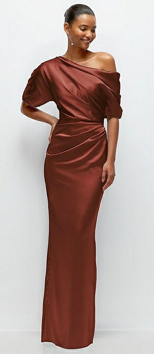 Asymmetrical Off-the-Shoulder Pleated Satin Maxi Dress in auburn moon