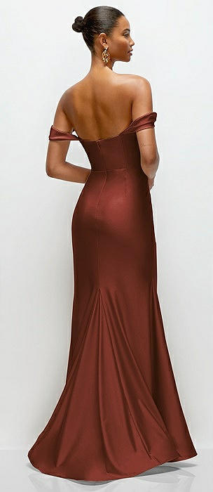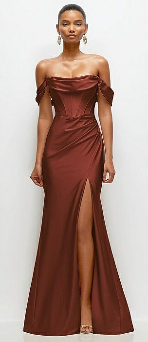 Off-the-Shoulder Corset Stretch Satin Mermaid Dress with Slight Train in auburn moon