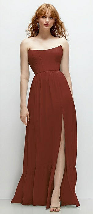 Strapless Cat-Eye Corset Maxi Dress with Ruffle Hem A-Line Skirt in auburn moon