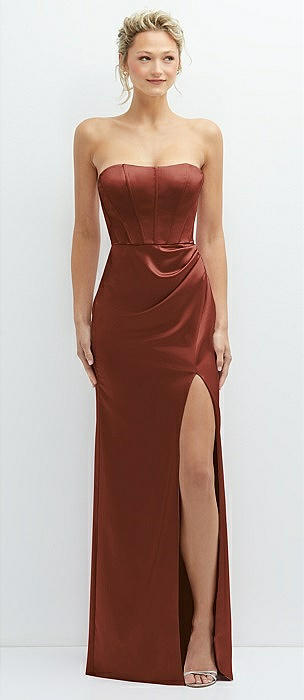 Strapless Topstitched Corset Satin Maxi Dress with Draped Column Skirt in auburn moon