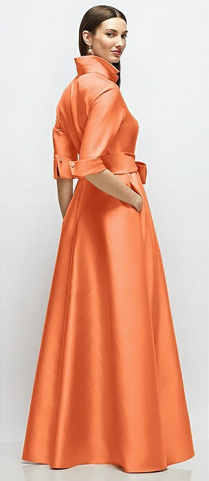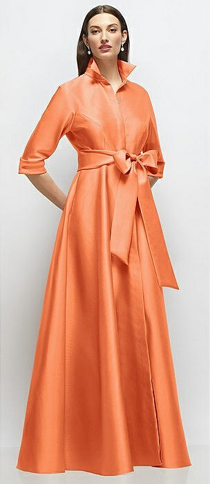 3/4 Sleeve Satin Shirt Dress Gown with Sash and Jeweled Buttons in portofino orange