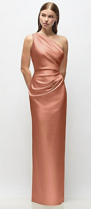 One-Shoulder Draped Bodice Stretch Satin Column Maxi Dress in copper penny
