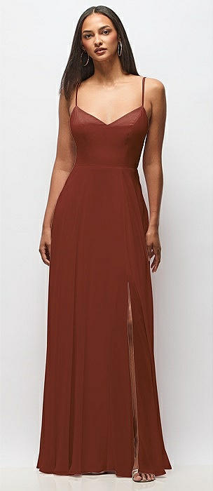 Spaghetti Strap Draped Skirt Gown with Front Slit in auburn moon