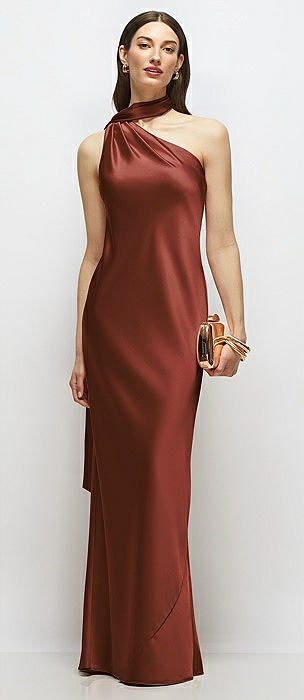 Draped Scarf Halter Open-Back Stretch Satin Bias Maxi Dress with Adjustable Straps in auburn moon