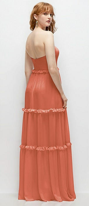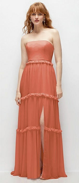Strapless Chiffon Maxi Dress with Tiered Micro Ruffle Full Skirt in terracotta copper
