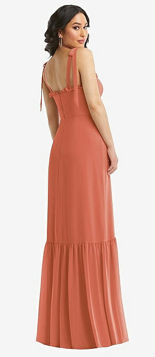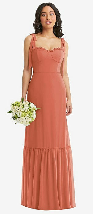 Tie-Shoulder Bustier Bodice Ruffle-Hem Maxi Dress in terracotta copper