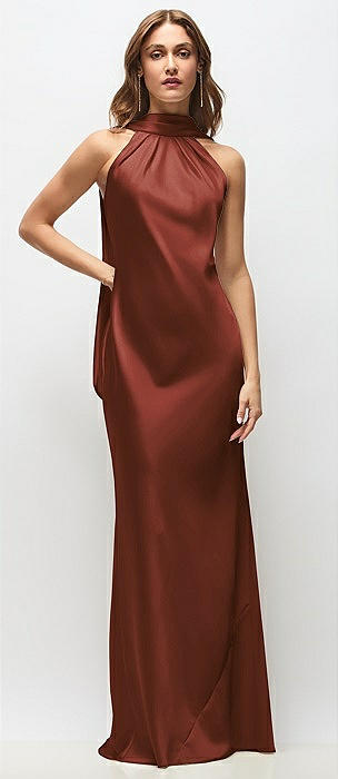 Draped Scarf Halter Open-Back Stretch Satin Bias Maxi Dress with Adjustable Straps in auburn moon