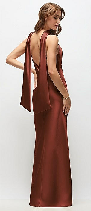 Stand Collar Bias Satin Maxi Dress with Self-Tie Bow Back in auburn moon