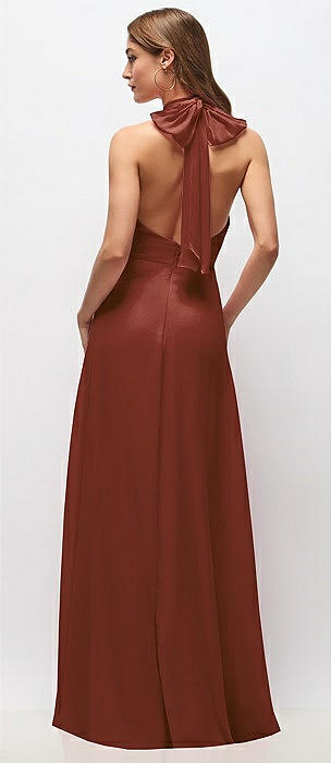 Pleated Halter Bias Satin Maxi Dress with Self-Tie Bow Back in auburn moon