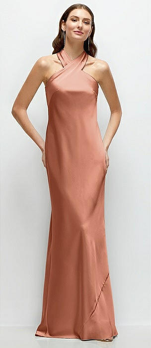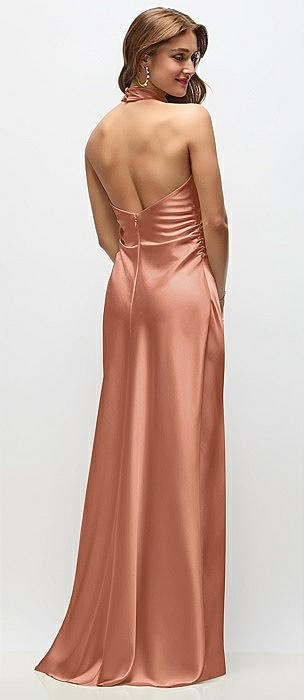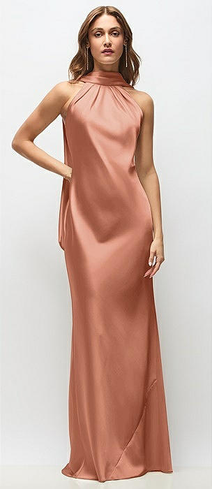 Draped Scarf Halter Open-Back Stretch Satin Bias Maxi Dress with Adjustable Straps in copper penny