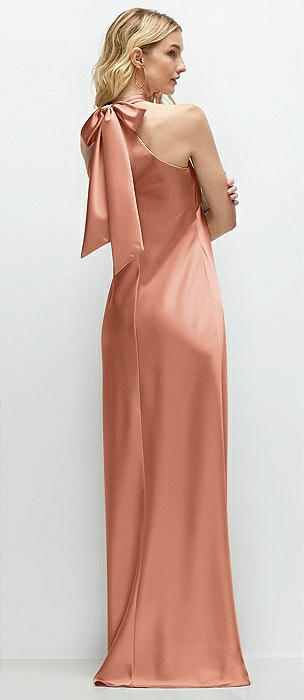 Pleated Halter Bias Satin Maxi Dress with Self-Tie Bow Back in copper penny