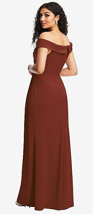 Cuffed Off-the-Shoulder Pleated Faux Wrap Maxi Dress in auburn moon