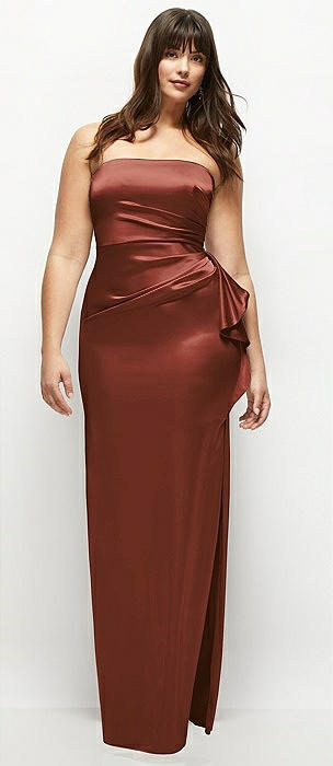 Strapless Draped Skirt Satin Maxi Dress with Cascade Ruffle in auburn moon