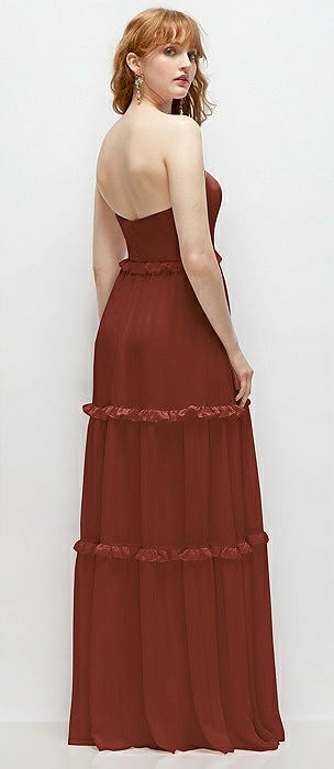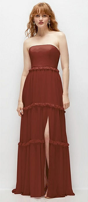 Strapless Chiffon Maxi Dress with Tiered Micro Ruffle Full Skirt in auburn moon