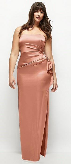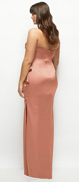 Strapless Draped Bodice Stretch Satin Column Maxi Dress in copper penny