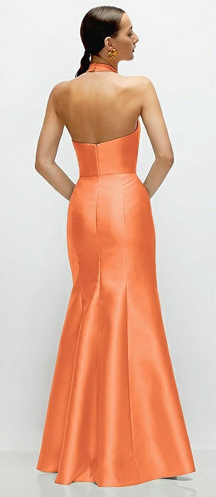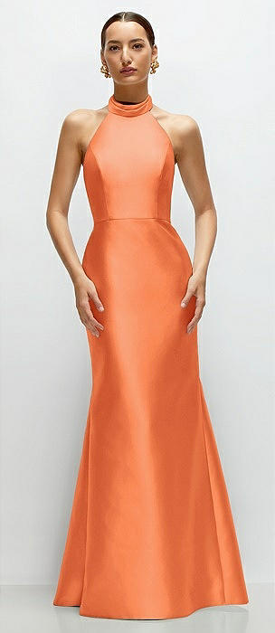 High-Neck Halter Open-Back Satin Trumpet Dress in portofino orange