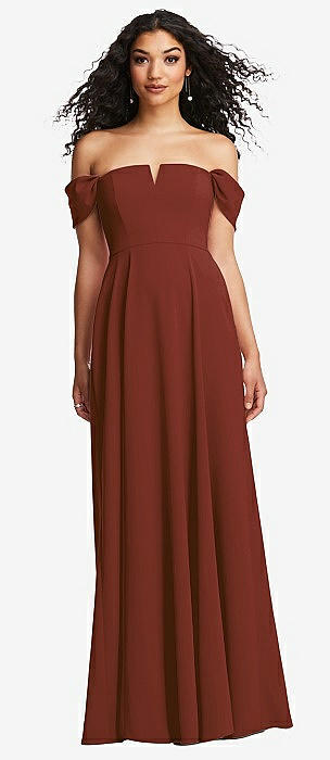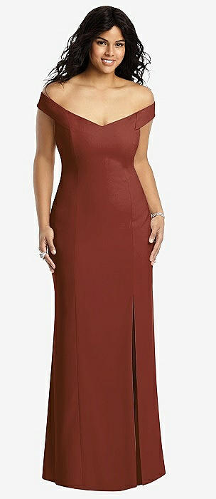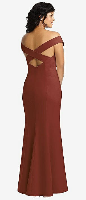 Off-the-Shoulder Criss Cross Back Trumpet Gown in auburn moon
