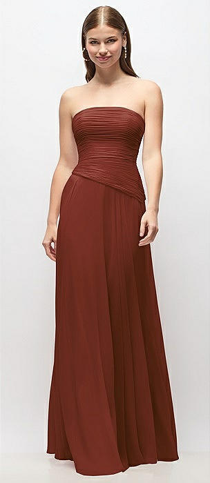 Strapless Chiffon Maxi Dress with Asymmetrical Ruched Drop Waist in auburn moon