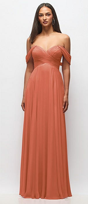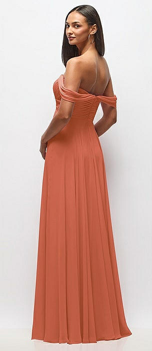 Orange Dessy Off-The-Shoulder Bridesmaid Dresses