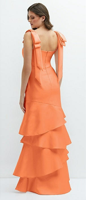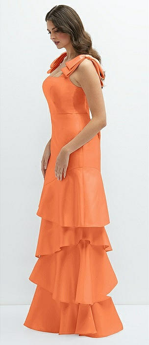 Bow-Shoulder Satin Maxi Dress with Asymmetrical Tiered Skirt in portofino orange