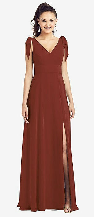 Bow-Shoulder V-Back Chiffon Gown with Front Slit in auburn moon