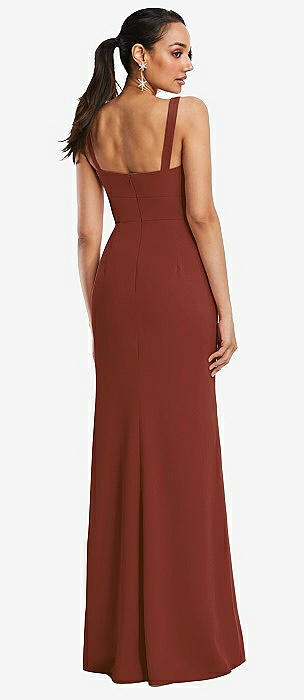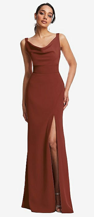 Cowl-Neck Wide Strap Crepe Trumpet Gown with Front Slit in auburn moon
