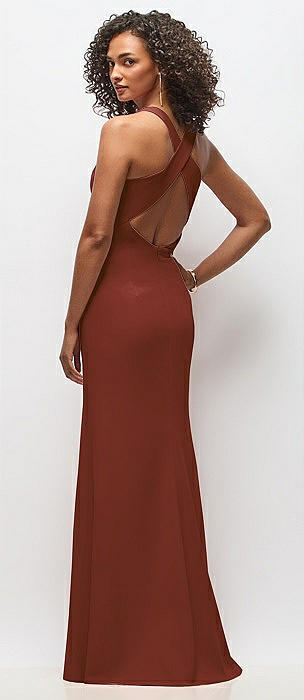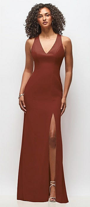 Notch Crepe Trumpet Gown with Front Slit in auburn moon