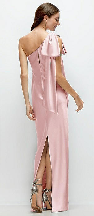 One-Shoulder Bias-Cut Satin Maxi Dress with Cascading Shoulder Bow in ballet pink