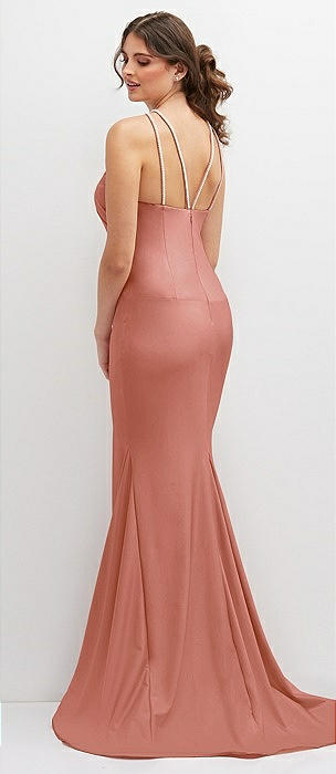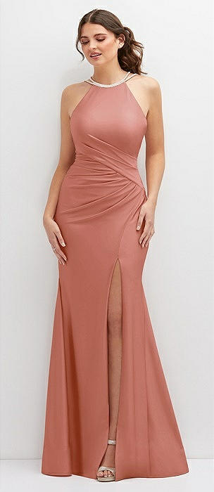 Halter Asymmetrical Draped Stretch Satin Mermaid Dress with Rhinestone Straps in desert rose