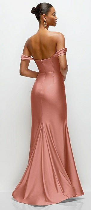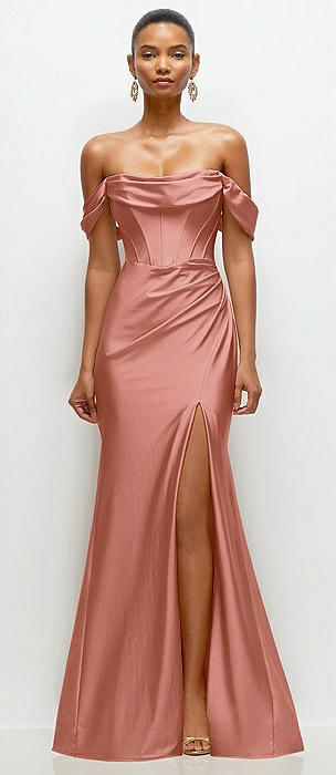 Cowl Neck Off-the-Shoulder Stretch Satin Fit and Flare Corset Maxi Dress in desert rose