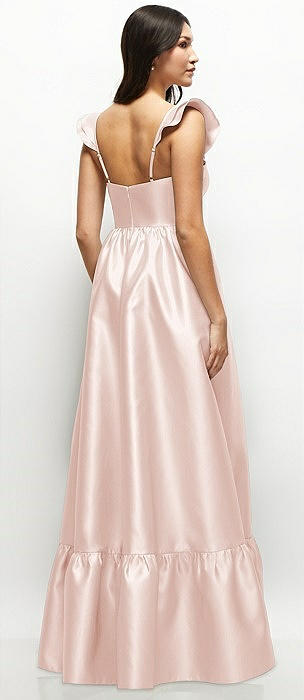 Bow-Shoulder Satin Maxi Dress with Asymmetrical Tiered Skirt in blush