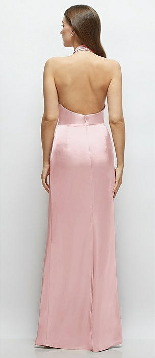 High Halter Tie-Strap Open-Back Satin Maxi Dress in ballet pink