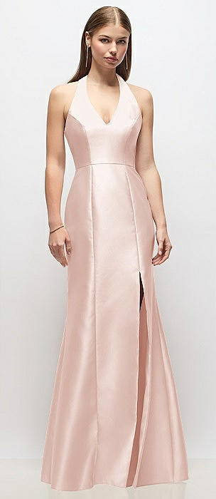 Shirred Skirt Jewel Neck Halter Dress with Front Slit in blush
