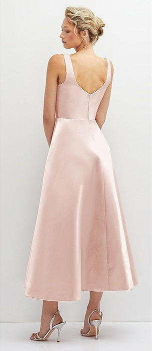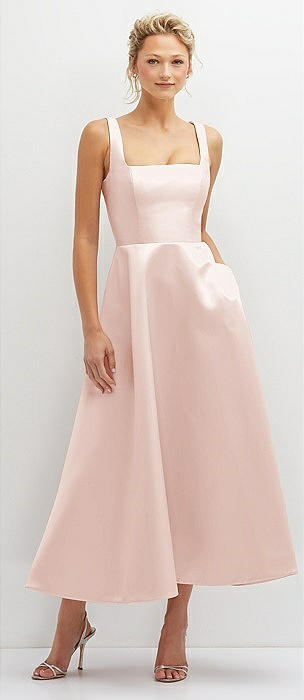 Square Neck Satin Midi Dress with Full Skirt & Pockets in blush