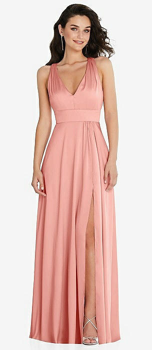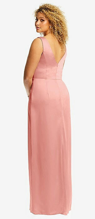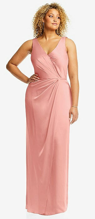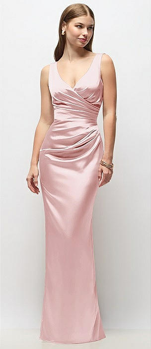 Sleeveless Draped Wrap Bodice Stretch Satin Column Maxi Dress in ballet pink
