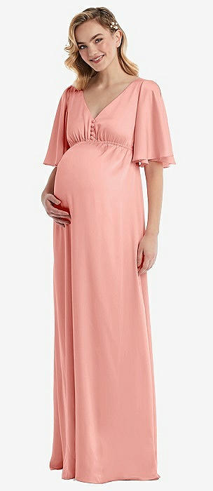 3/4 Sleeve Satin Shirt Dress Gown with Sash and Jeweled Buttons in blush