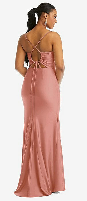 Cowl-Neck Open Tie-Back Stretch Satin Mermaid Dress with Slight Train in desert rose
