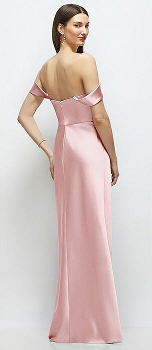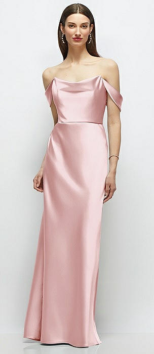 Basque-Neck A-Line Stretch Satin Maxi Dress with Off-the-Shoulder Drape in ballet pink