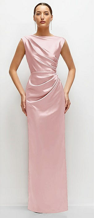Strapless Draped Bodice Stretch Satin Column Maxi Dress in ballet pink