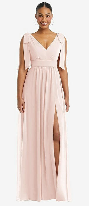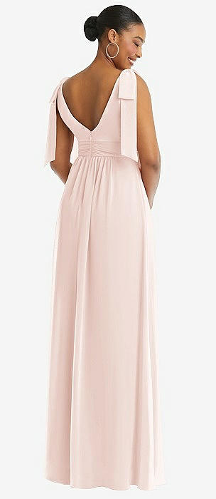 Plunge Neckline Bow Shoulder Empire Waist Chiffon Maxi Dress in blush