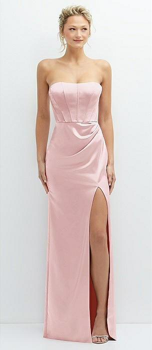 Strapless Topstitched Corset Satin Maxi Dress with Draped Column Skirt in ballet pink