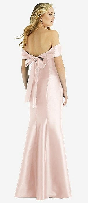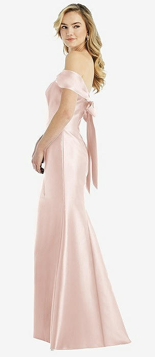 Off-the-Shoulder Bow-Back Satin Trumpet Gown in blush