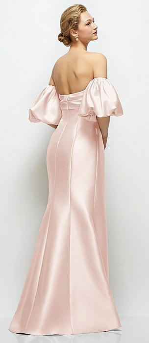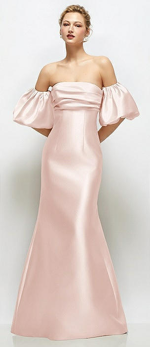 Off-the-Shoulder Puff Sleeve Satin Maxi Dress with Flared Skirt in blush