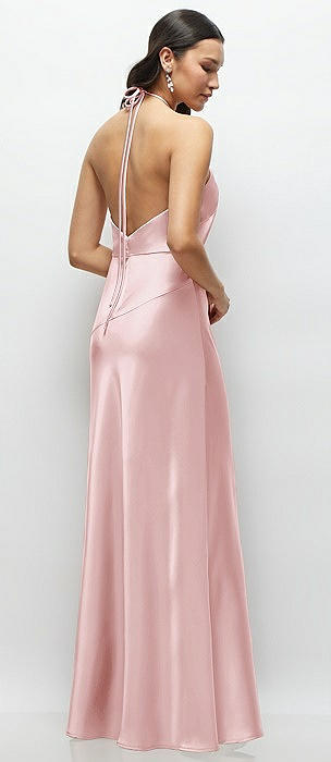 High Halter Tie-Strap Open-Back Satin Maxi Dress in ballet pink