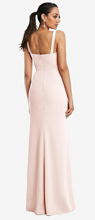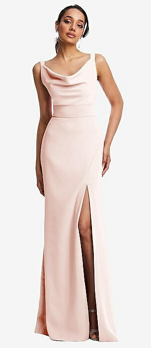 Cowl-Neck Wide Strap Crepe Trumpet Gown with Front Slit in blush