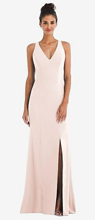 Notch Crepe Trumpet Gown with Front Slit in blush