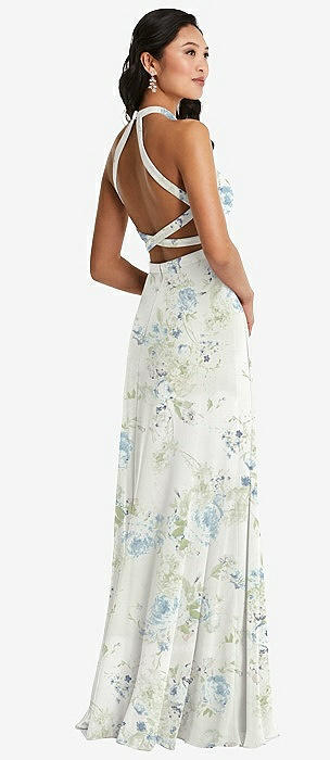 Stand Collar Halter Maxi Dress with Criss Cross Open-Back in bleu garden