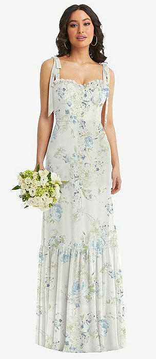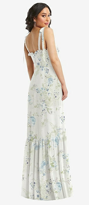 Tie-Shoulder Bustier Bodice Ruffle-Hem Maxi Dress in bleu garden