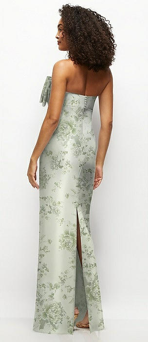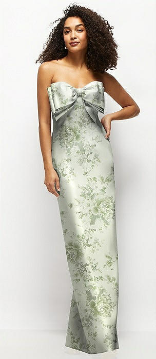 Strapless Floral Satin Column Maxi Dress with Oversized Bow in sage cottage rose